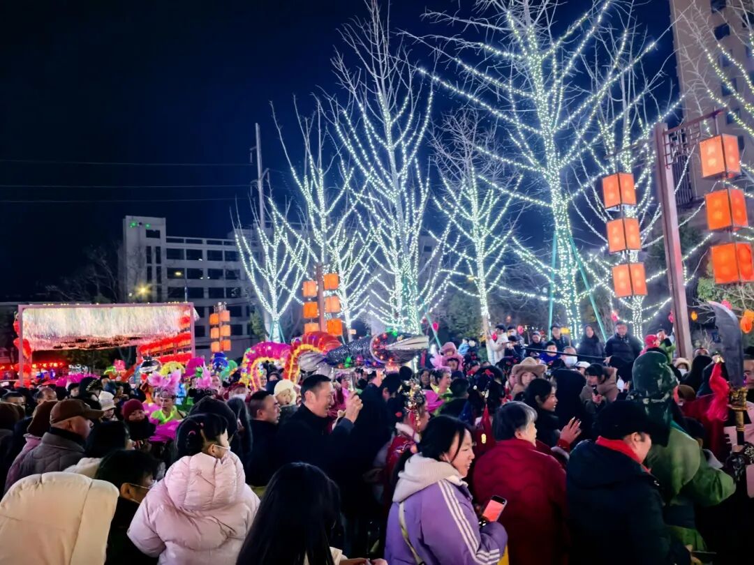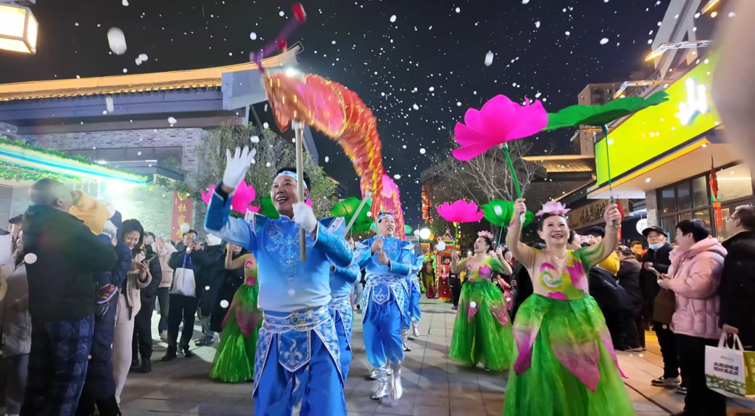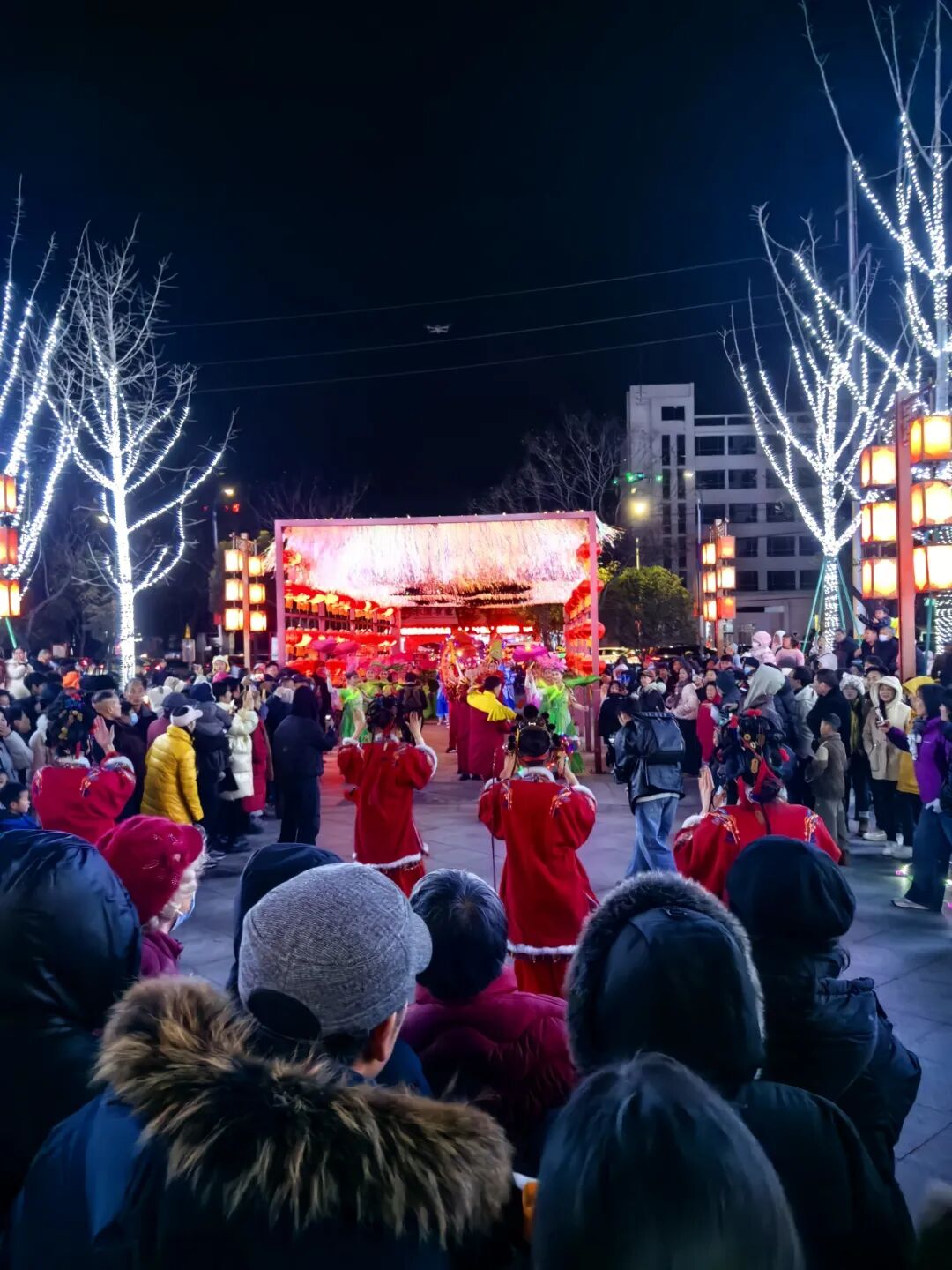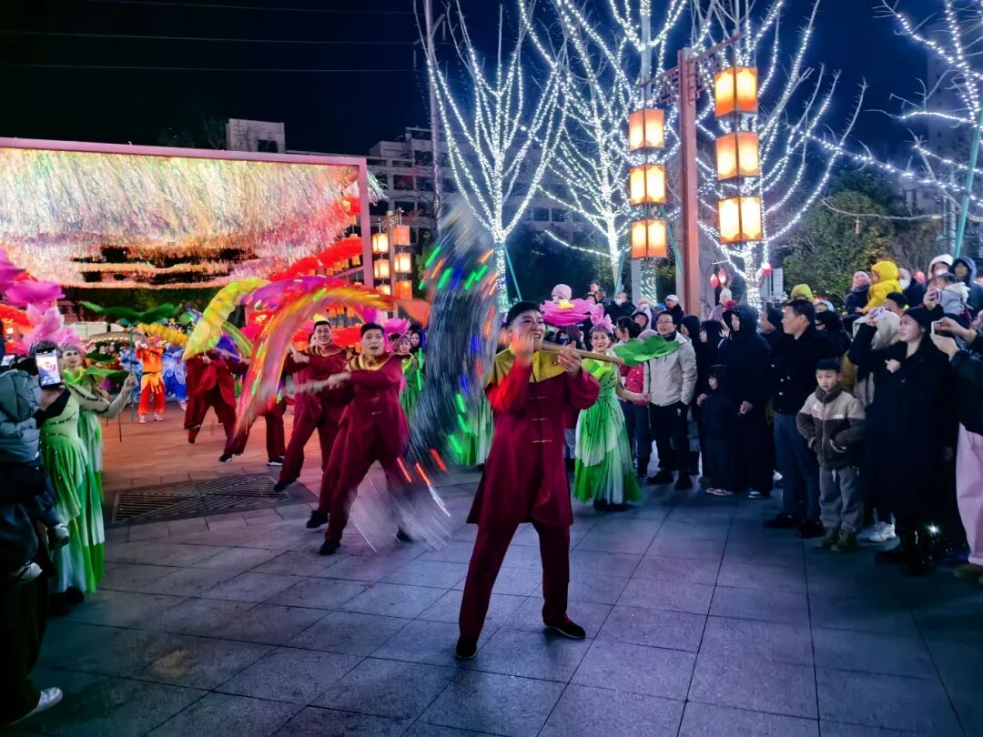 欢乐的锣鼓声起,巡游队伍从荆街入口缓缓行进,瞬间打破了夜色的静谧。竹篾扎制、绸布裱糊的五虾一鲇灵动登场,虾身活节联动,扭动间铜铃清脆作响,鲇鱼头尾鳍灵活摆动,时而“跳龙门”时而“幂水游”,五只彩虾围绕鲇鱼摆出“菊花开”“双翅展”的队形,“上打雪花盖顶,下打枯树盘根”的经典套路引得沿街观众连连喝彩 。这源自江汉水乡的灯舞,将“年年有余”的吉祥寓意藏在鱼虾嬉戏间,让不少现场观众想起儿时挤在巷口看表演的时光:“小时候过年就盼着这阵仗,听着铃铛响就知道年味来了!”