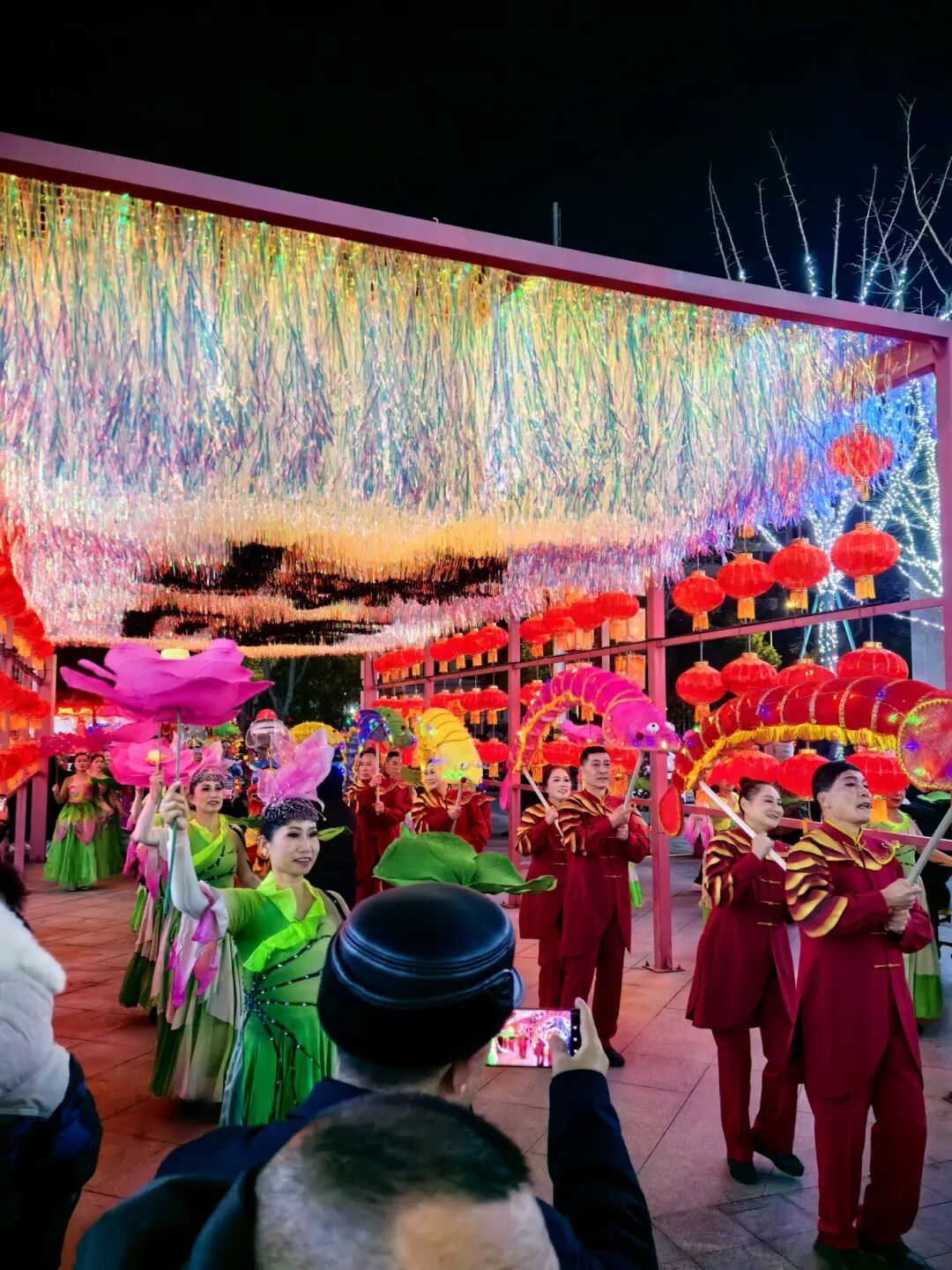 紧随其后的采莲船与蚌壳精更是趣味十足。红绸装饰的莲船在艄公的竹篙牵引下轻轻摇摆,船尾的“摆梢婆子”摇着蒲扇,伴着“采莲船那么哟哟,新年好那么呀嚯”悠扬的唱词打趣逗乐;身着华服蚌壳精开合之间尽显灵动,滑稽的表演让孩子们追着队伍跑,几位胆大的小朋友还被邀请客串“小蚌壳精”,稚嫩的动作引得全场欢笑不断 。孩子们追着队伍欢呼,好奇地触摸灯彩的纹路;年轻人举着手机记录精彩瞬间,打卡这份独特的“荆州民俗”;几位老大娘自发跟着节奏哼唱起来,熟悉的旋律勾起了共同的乡愁记忆。有市民主动加入巡游队伍,学着摆弄简易道具,与非遗传承人一同起舞,笑声与锣鼓声交织成最动人的新年乐章。